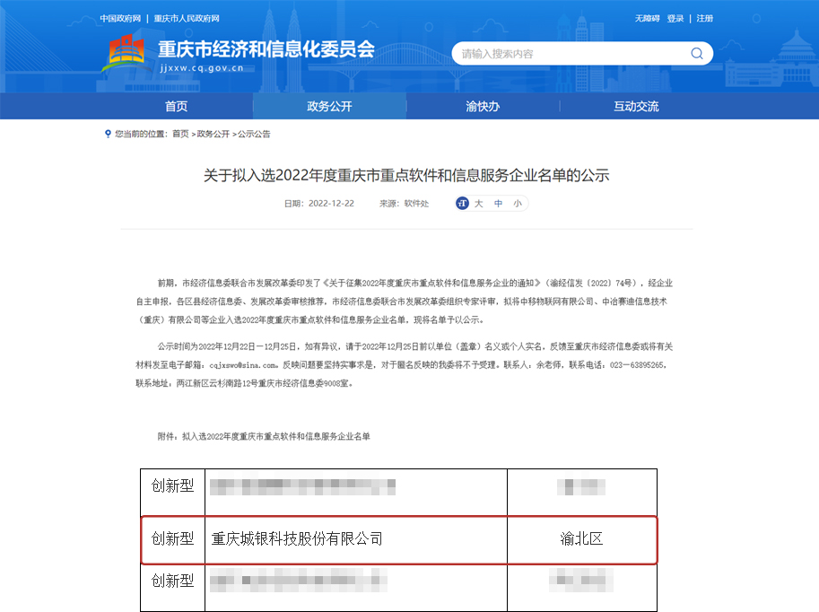 PRESS CENTENR近期,由各區(qu)縣經濟(ji)(ji)信息(xi)委(wei)、發展改革委(wei)審核推薦(jian),市經濟(ji)(ji)信息(xi)委(wei)聯合市發展改革委(wei)組織專(zhuan)家評審城銀股份入(ru)選(xuan)2022年度重慶市重點軟件和信息服務企業名單。這也是(shi)公司連(lian)續第四(si)年獲此(ci)殊榮,這(zhe)也是社會各(ge)方對城銀股份技(ji)術實力和服務能力的(de)再次肯定。