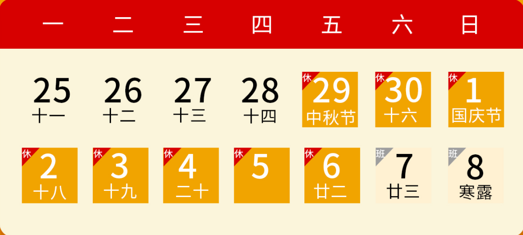 花(hua)好月(yue)圓,國泰民安(an),我司按照國家(jia)規定于2023年9月29日-2023年10月6日放假調休共8天。2023年10月7日恢復正常上班。