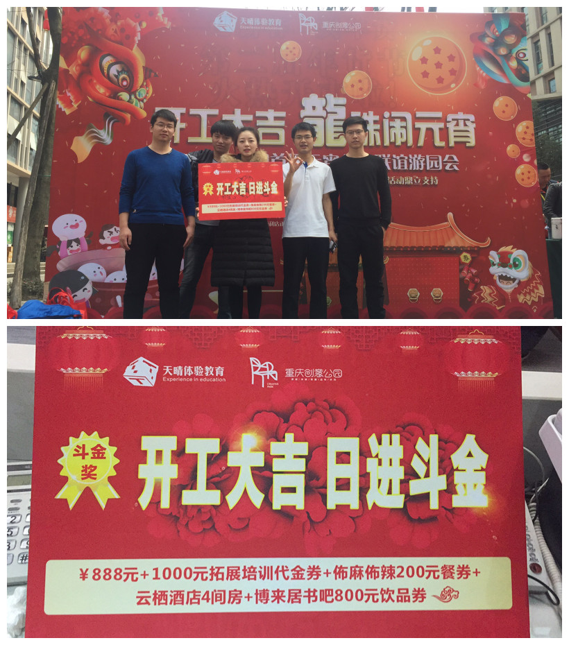 歡度元(yuan)宵的習俗多種多樣(yang),共吃元(yuan)宵、燃燈放(fang)焰(yan),喜(xi)猜(cai)燈謎,重慶創意公園則舉辦了“開工(gong)大(da)吉、龍珠鬧元(yuan)宵”的企業(ye)聯誼游園活(huo)動(dong),城銀科技的五位員(yuan)工(gong)(俊(jun)男美女(nv))參(can)加了此次活(huo)動(dong)。