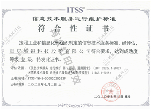 PRESS CENTENR近(jin)日(ri),城銀股份獲得了國家級信(xin)息(xi)技術服務運行維護標準符合性證書。按照工業(ye)和(he)信息化(hua)部(bu)組織制定的(de)信息技術服務標準,經評估,達到(dao)成熟度等(deng)級(ji)三級(ji)。