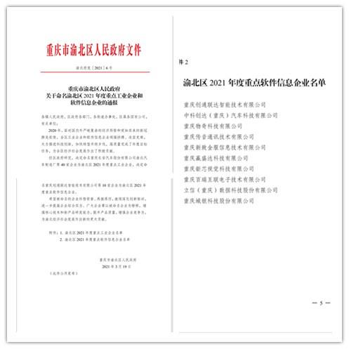 PRESS CENTENR近日,重慶市渝北區人民政府公布了(le)2021年度重點工業企(qi)業和軟件信息(xi)企(qi)業名(ming)單,以(yi)經營狀況、人(ren)員(yuan)素質(zhi)、自(zi)主知識產權、研(yan)發能(neng)力、社會責任等(deng)多維(wei)度評(ping)價,經研究決(jue)定(ding)命名我司為渝北區2021年度(du)重點軟(ruan)件信(xin)息企業。